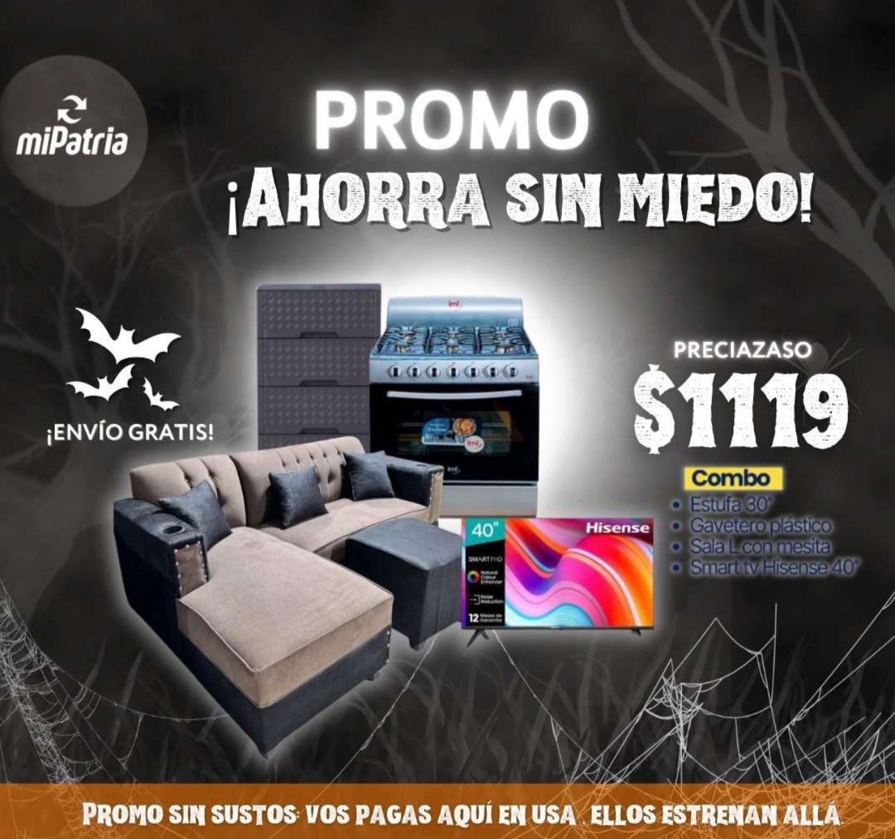 Este combo se presenta como una oferta temática de Halloween o "terror" (por los murciélagos y telarañas), incluyendo un envío gratis y un conjunto de cuatro artículos esenciales para el hogar: sala, cocina, entretenimiento y almacenamiento.