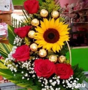 Arreglo en canasta con 6 rosas del color de su elección, 1 girasol acompañado de fresco follaje y 8 chocolates Ferrero Rocher