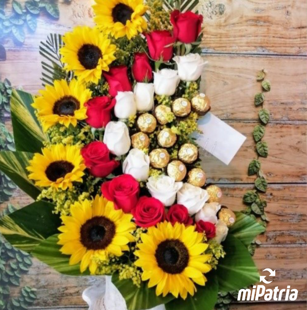 Arreglo en base de barro con 7 girasoles, 20 rosas del color de su elección y 16 chocolates Ferrero Rocher acompañado de fresco follaje.