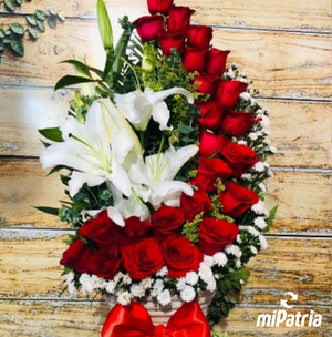 Arreglo en base de barro con, 24 rosas del color de su elección Y 3 ramas de lirio acompañado de fresco follaje.